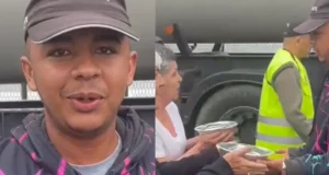 Ação solidária em congestionamento: motorista entrega marmitas a motoristas em rodovia.