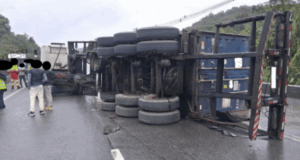 Carreta com 26 toneladas de sucata tomba em rodovia de Santos