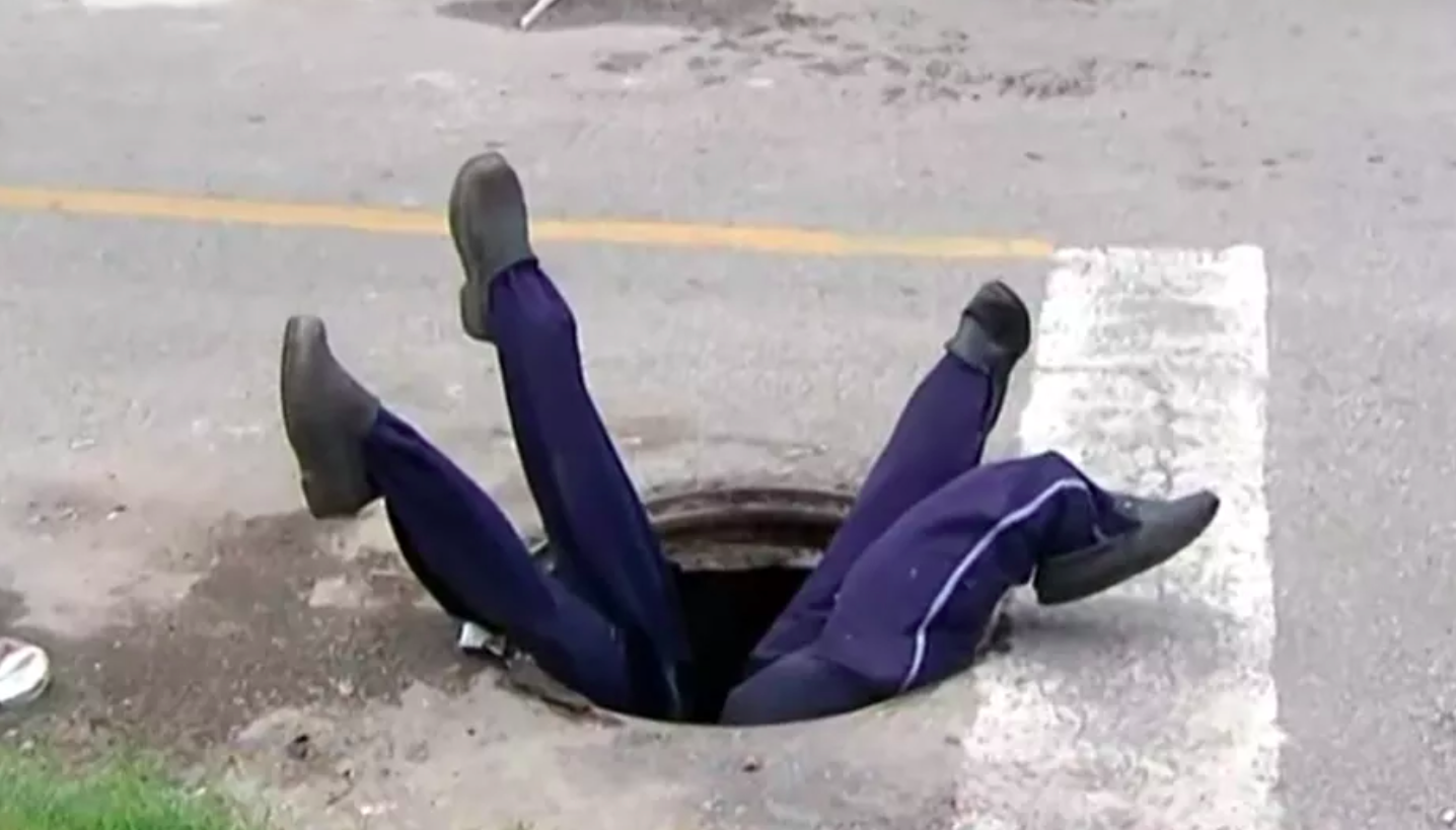 Moradores usam bonecos com pernas para cima para sinalizar bueiro sem...