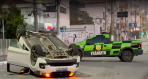 Carro fura bloqueio da PM, bate e capota em São Vicente...