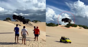 Carro voa por cima de buggy em duna de Canoa Quebrada,...