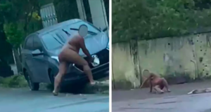 Homem em surto psicótico anda pelado e danifica carro em rua...
