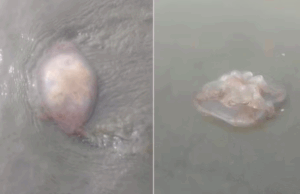 Água-viva é encontrada na faixa de areia em praia de Santos.